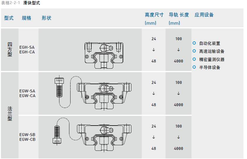 EG系列提供法蘭型及四方型兩種直線導軌。