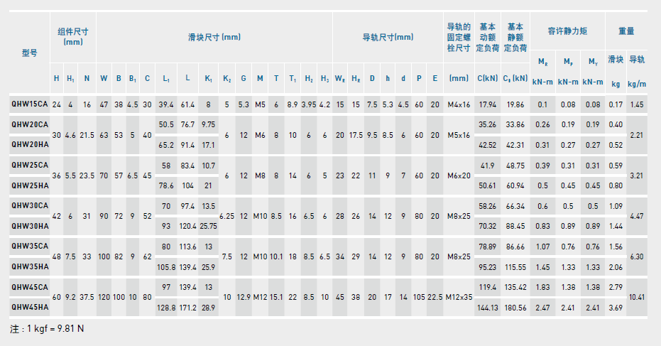 安裝導軌時是否鎖緊貼平基準面影響直線導軌精度甚劇,因此為達到每顆螺絲都能鎖緊的目的,建議使用下列扭力值鎖裝配螺絲。
